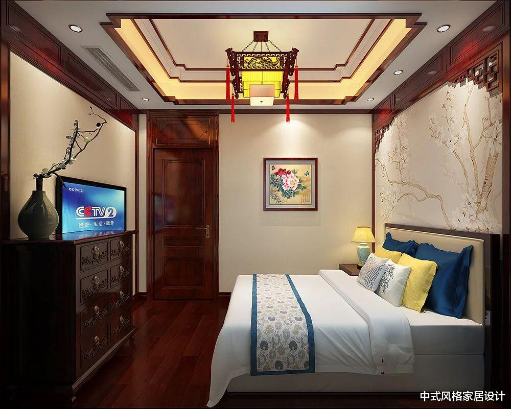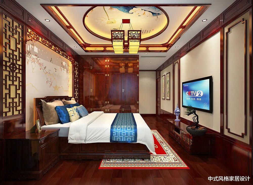 中式古典风格卧室,整体典雅庄重。深色实木家具(床头柜、衣柜)与雕花屏风环绕,线条流畅,纹理清晰。圆形穹顶搭配暖黄色灯带,中央悬挂木质镂空吊灯,光影柔和。床铺铺蓝白几何纹床旗,床头背景墙饰水墨山水画,两侧对称壁灯与装饰画点缀,尽显东方美学韵味。