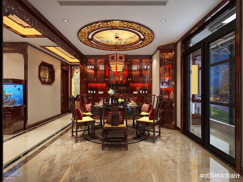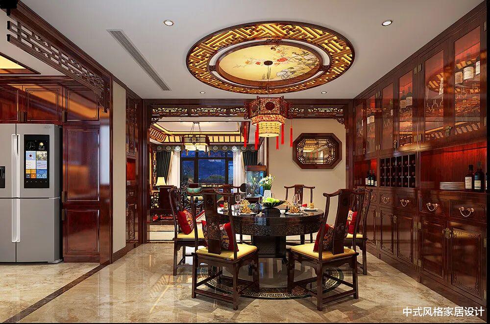 中式别墅餐厅,整体以深沉优雅的古典气质为主。圆形餐桌搭配红木餐椅,椅面铺明黄软垫,椅背靠枕点缀暗红刺绣,与深棕色实木家具形成色彩对比。圆形雕花吊顶嵌入传统纹样,中央悬挂水墨山水画,下方垂落红灯笼造型吊灯,暖光映照下尽显古韵。一侧为玻璃酒柜,内藏红酒与精致摆件;另一侧是深色实木餐边柜,柜门饰有铜制拉手。地面铺设米白大理石,边缘以深色线条勾勒,与木质家具的温润质感相互映衬,营造出兼具气度与自然氛围的中式雅居空间。