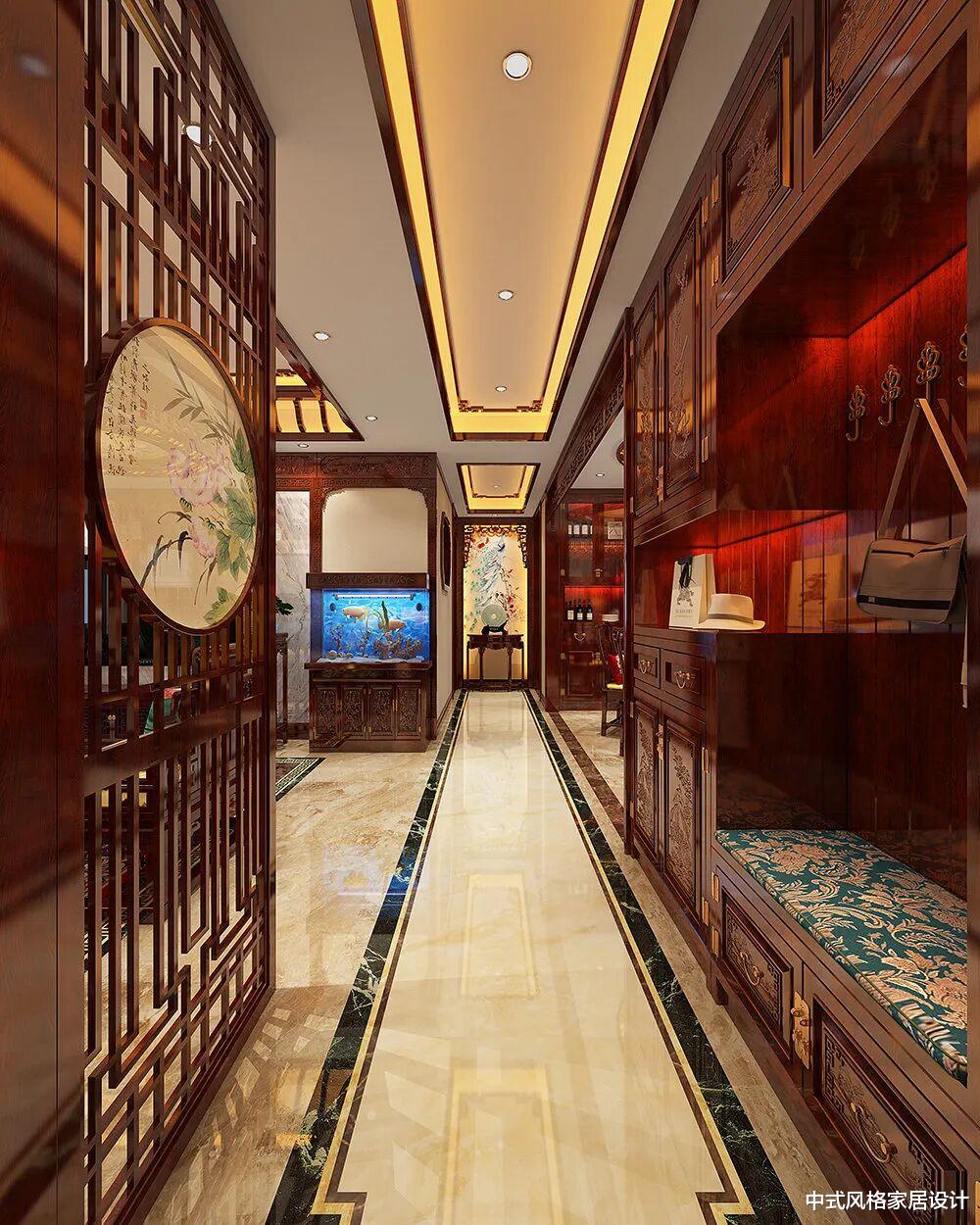 中式风格别墅走廊,整体呈现深沉优雅的古典气质。深色实木雕花屏风,镂空纹样透光,旁挂圆形水墨花卉挂画。红木玄关储物柜,上置青瓷瓶与卷轴字画,下方配青花纹饰坐垫的长凳。米白大理石地面拼接金色线条,尽头设鱼缸造景,灯光透过格栅洒落,光影层次丰富。以红木、青花、水墨为元素,融合传统工艺与现代灯光设计,尽显儒雅大气的东方美学。