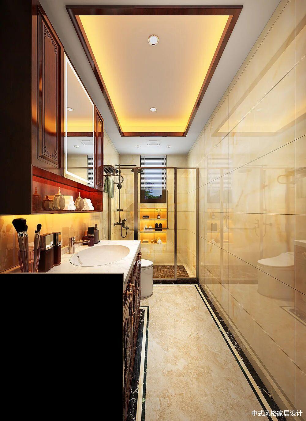 中式风格卫生间,整体设计儒雅大气。墙面与地面铺浅米色大理石瓷砖,搭配深色木质吊顶,线条沉稳。左侧设嵌入式洗手台,台面整洁,镜柜内摆放陶瓷瓶罐;右侧为玻璃隔断淋浴区,地面铺防滑地砖。顶部暗藏式灯光勾勒吊顶轮廓,暖黄色光线营造温润氛围,兼具古典韵味与现代舒适感。