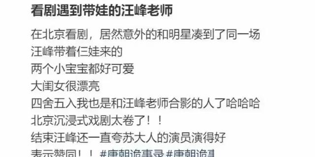 汪峰带三孩看话剧场景,参照当事人微博及现场观众路透图文;