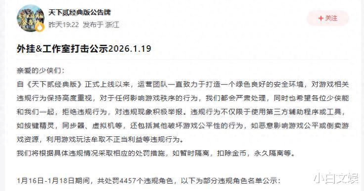 这两天最值得一提的大事当属天下贰经典版开启了第二轮外挂、工作室的打击,继上次开服三天查处2000+外挂及工作室账号后,最近又查处了1月16日及1月18日期间的4457个违规角色。不仅让更多玩家们感受到了游戏的公屏,同时也让那些依靠脚本搬砖的工作室收到了应有的惩罚。