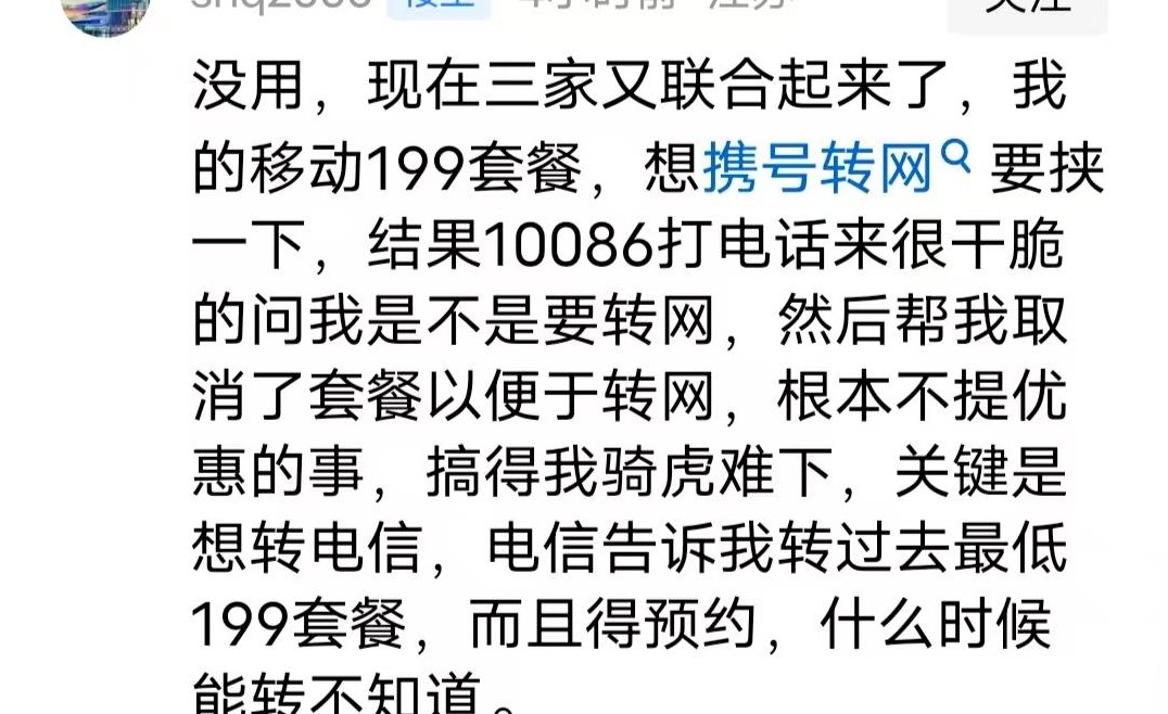 199的套餐老客户都不挽留一下,可见该运营商是真的不怕,根本不在乎你的去留,而且想转的那家运营商也没有拿出多少诚意和热情,难免让人觉得他们几家运营商联合起来了。