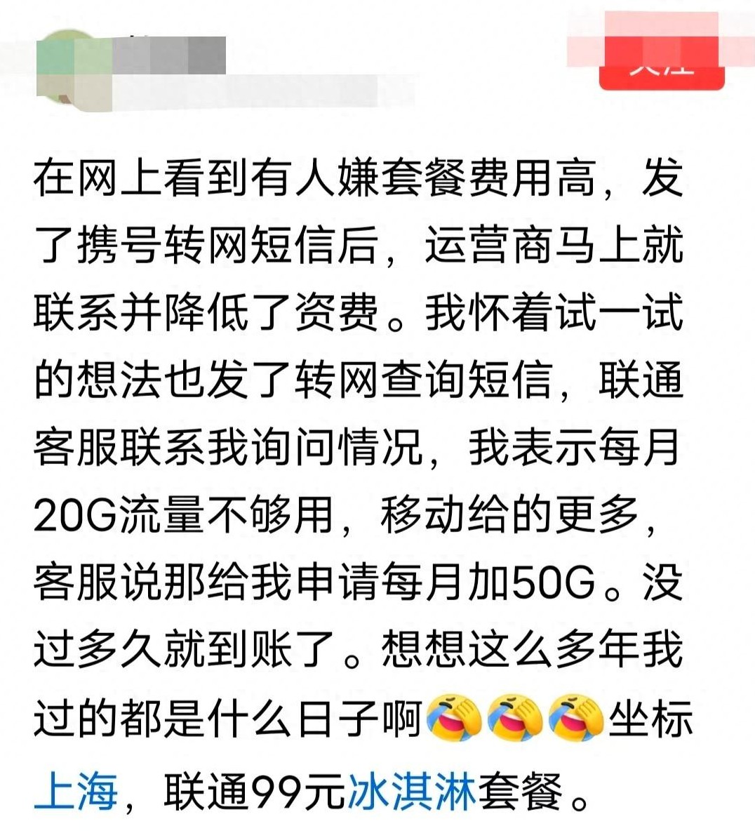 携号转网其实就是保留了原号码但更换了运营商,如果你觉得现在的运营商收费过高或者不合理,可以尝试考虑一下转网。有网友在网上看到有人嫌套餐费用高,发了携号转网短信后,运营商马上就联系了对方并降低了资费,于是该网友也打算试一试,于是发了转网短信,果然联通客服联系了她并询问了情况,该网友如实回答,说每月的流量不够用,转移动的话对方给的更多。