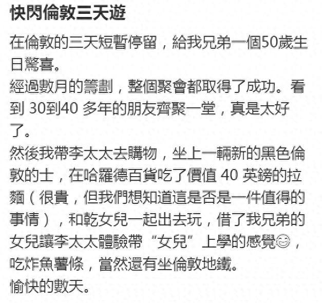 这次伦敦之行,虽然短暂,却充满了温馨与感动。从与老友的欢聚,到与妻子的甜蜜陪伴,再到对“女儿梦”的短暂体验,每一个细节都展现了他们对生活的热爱和对家人的珍视。