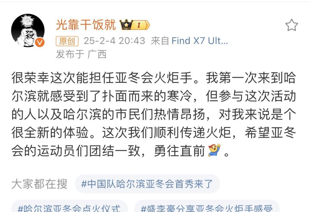 昔年奥运刷了存在感,此番亚冬火把手。巴黎落幕后名声大振,盛哥儿捧着金牌回乡下。我等小虎队儿人手攥几串铜钱迎接他,往日教导我等射箭的导师成了全国英雄,人从了高处多念众生。