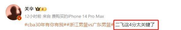 老将任俊飞值得一说,就像又回到了自己的巅峰状态,进攻效率高得惊人。全场比赛他9次出手投进8个,三分球2投2中,得了全队最高的21分,这不仅广东球迷没想到,浙江球迷也觉得惊奇。任俊飞在末节的表现更精彩,中投、三分、补篮都有,5次出手全中,几乎把比赛掌控在自己手里,成了强有力的终结者。这情况让球迷和跟队记者关辛都为他激动。任俊飞被评为本场最佳球员是理所当然的。跟队记者马上就在社交平台连发三条动态大力夸赞35岁的任俊飞,他写道:“二飞!真的是家有一老啊!”最后关辛激动地说:“今晚的二飞,让我看哭了,谁说人不能再少年?”全场任俊飞的进攻效率特别高,表现非常燃,怎么夸他都不过分。