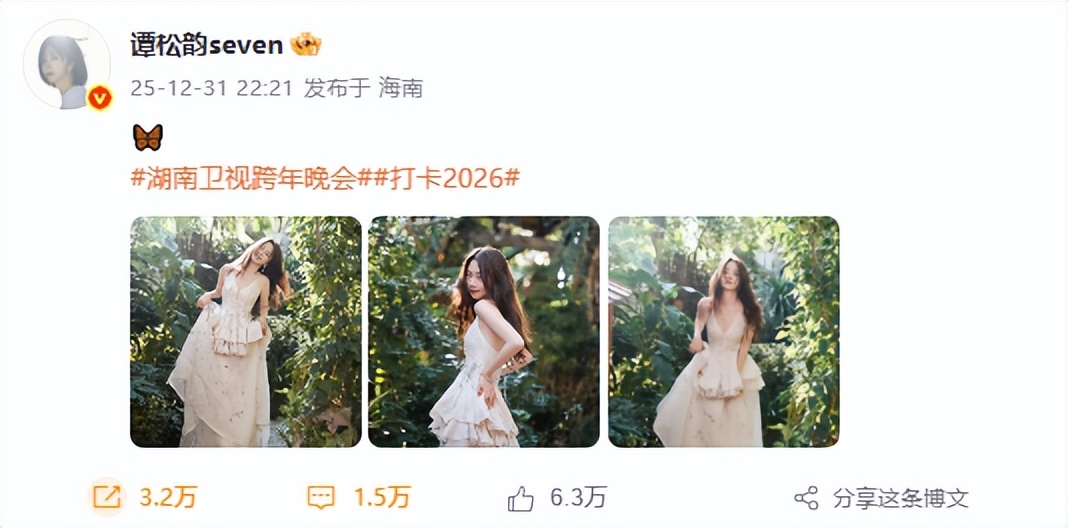 2025 年最后一晚的海南,热带晚风裹着枝叶的潮气,谭松韵踩着这股软,把浅米蛋糕裙藏进了绿植丛里。她的跨年动态没带舞台的亮,只有裙褶蹭着叶边的轻,和湖南卫视跨年晚会后卸了劲儿的松弛。