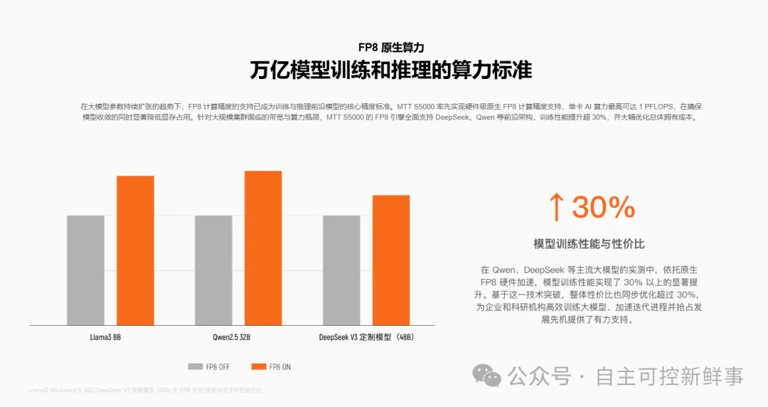 万卡集群的系统能力离不开核心硬件的突破。MTT S5000作为面向生成式AI时代的全功能GPU,专为大模型训练与推理及高性能计算设计。凭借先进的"平湖”架构,MTT S5000产品提供从FP8到FPG4的全精度算力支持,属于国内率先原生支持FP8精度的训练GPU,并配置了硬件级FP8 Tensor Core加速单元,在推理性能上树立了国产单卡新标杆。