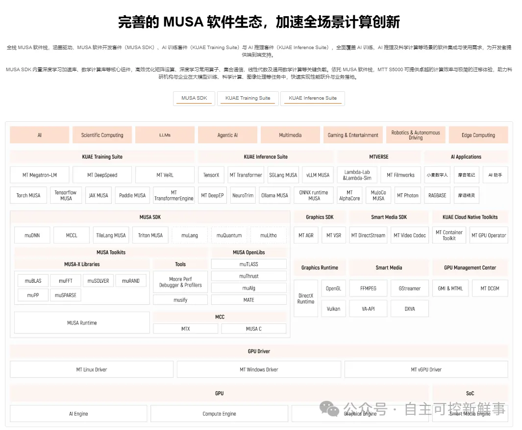 整体来看,摩尔线程MTT S5000在推理与训练两侧的实绩,标志着国产全功能GPU已跨越“训推一体”的技术门槛,这不仅是单一产品的突破,更是从芯片、架构、集群到软件栈的全链条能力提升。
