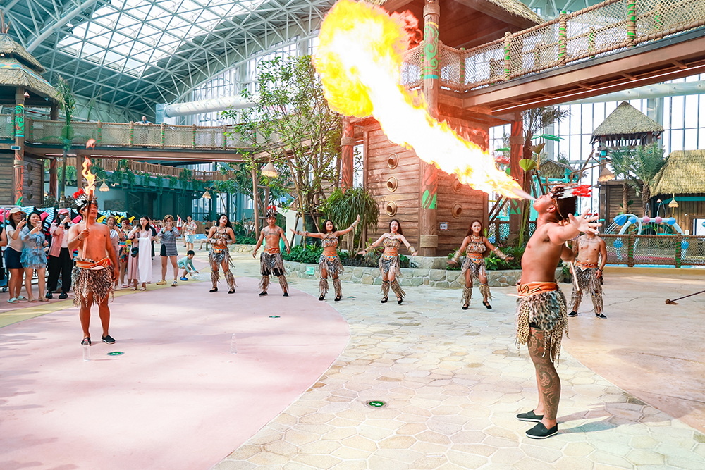 室外水乐园总面积18000㎡,呈现浓郁的大溪地热带村、滩、林、岛风情。1800㎡的超级火山造浪池配备顶级音响系统,激情在此刻彻底释放,搭配“翻天覆地”滑道组合,以及魔法隧道、时空穿梭等视觉特效,激活多巴胺,体验如激流直坠般的快感。
