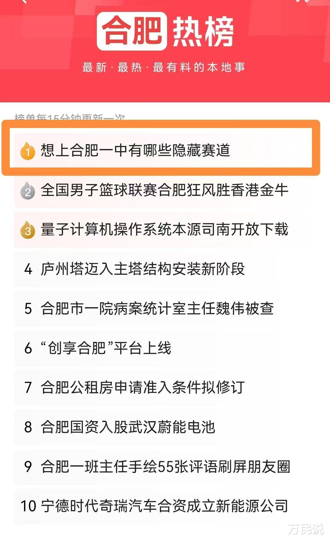 就在大年初九,我们一篇《想上合肥一中有哪些隐藏赛道》意外出圈,霸榜合肥热榜第一名,被众多班主任和教育博主转发。这让我们意识到,无论中考还是高考,家长们对优质信息的渴求从未改变。