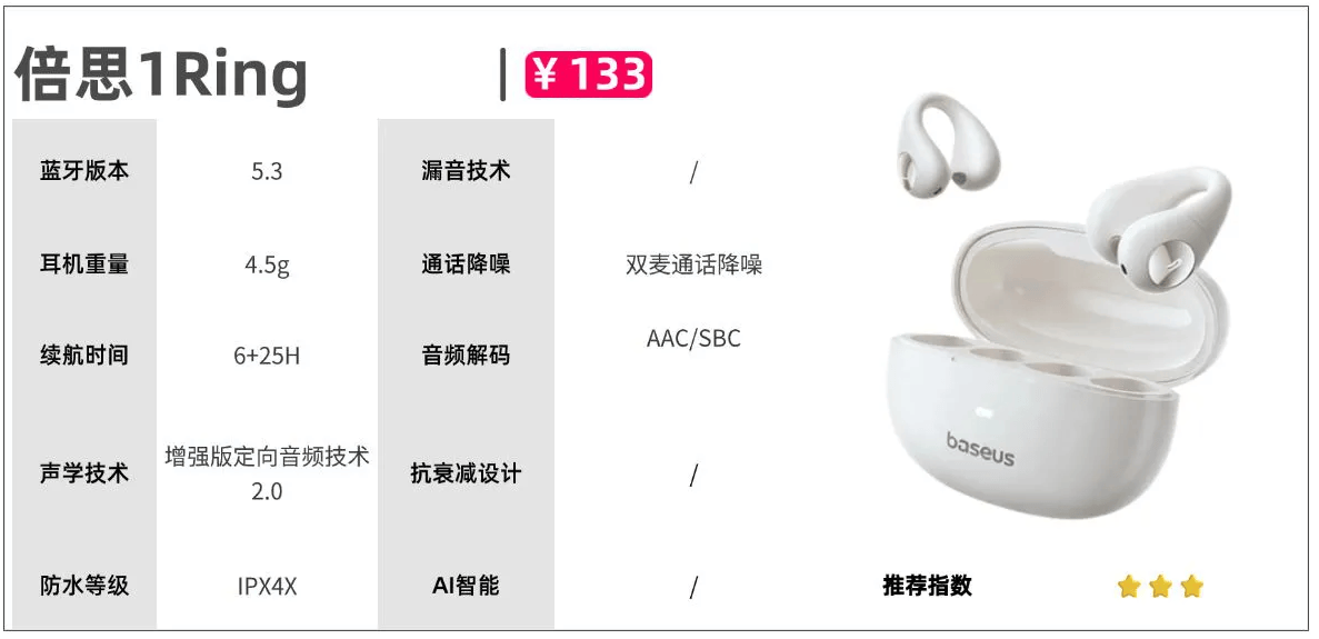 支持蓝牙5.3,双麦智能降噪进行基础优化。续航为单次6小时,综合25小时,防护等级为IP4X,仅防汗防尘。整体来看,倍思1Ring是一款将轻量化做到极致的入门产品,它牺牲了大部分音质来换取极致的佩戴舒适度和便携性,仅适合对音质毫无要求,仅用于通话和偶尔听资讯的用户。