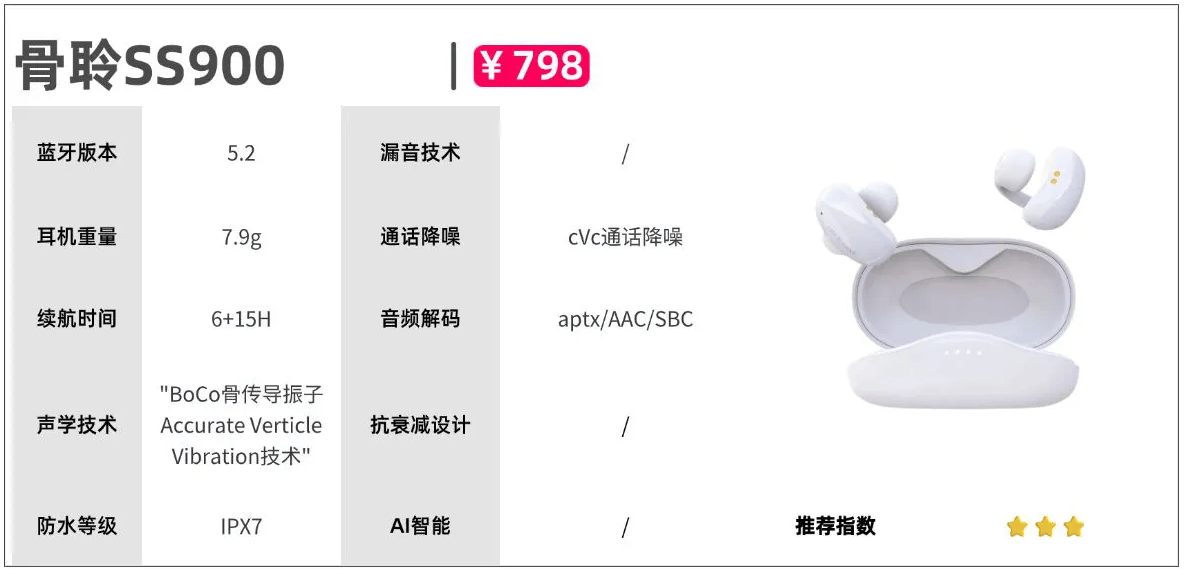 骨聆SS900支持蓝牙5.2,并具备aptX、AAC和SBC音频解码,提供了高质量的无线连接。它搭载cVc通话降噪技术,能有效提升语音通话的清晰度。续航方面,单次充电可使用8小时,配合充电盒可达16小时。