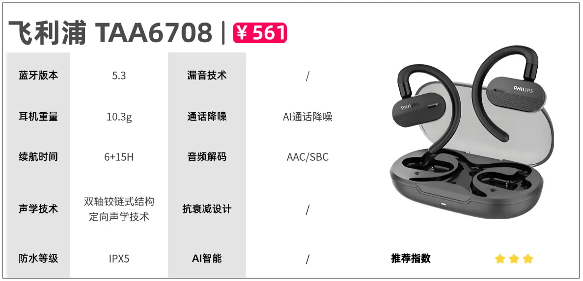 飞利浦TAA6708采用分体式耳挂设计,配备独特的双轴铰链结构,支持多角度调节以适应不同耳型。搭载14.2mm驱动单元并采用定向声学技术,声音传播指向性明确。人声表现清晰自然,高频细节保留完整,中频密度适中。不过在低频量感和动态表现方面中规中矩,对于重低音音乐类型表现力相对有限,更适合人声、轻音乐等日常聆听场景。