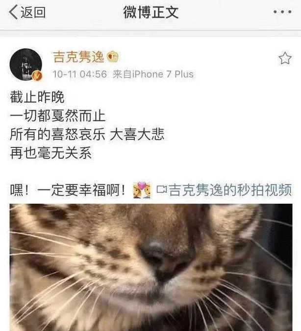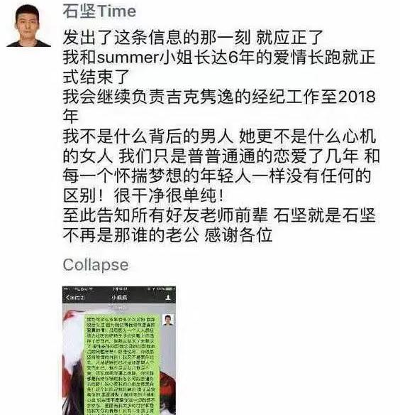 2017年,刘石坚发朋友圈官宣和吉克隽逸分手。