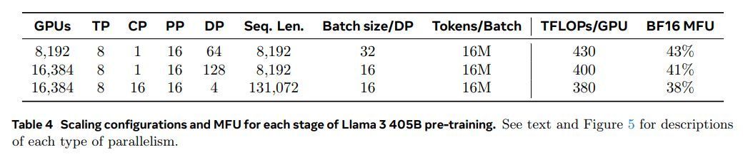 GPU 利用率。通过仔细调整并行配置、硬件和软件,我们实现了 BF16 模型 FLOPs 利用率(MFU;Chowdhery et al. (2023)) 的 38-43%。表 4 中显示的配置表明,与 8K GPU 和 DP=64 上的 43% 相比,16K GPU 和 DP=128 上 MFU 降至 41% 是由于需要降低每个 DP 组的批量大小以保持训练期间全局标记数不变。