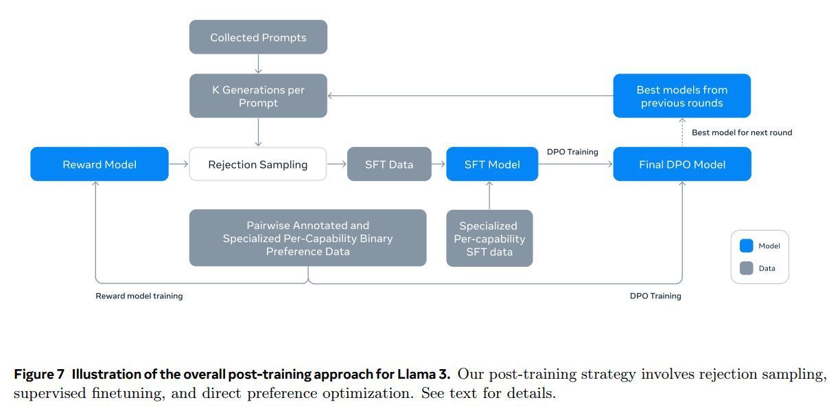 (2) 后训练阶段: 模型被微调以遵循指令、与人类偏好保持一致,并提高特定能力(例如,编码和推理)。