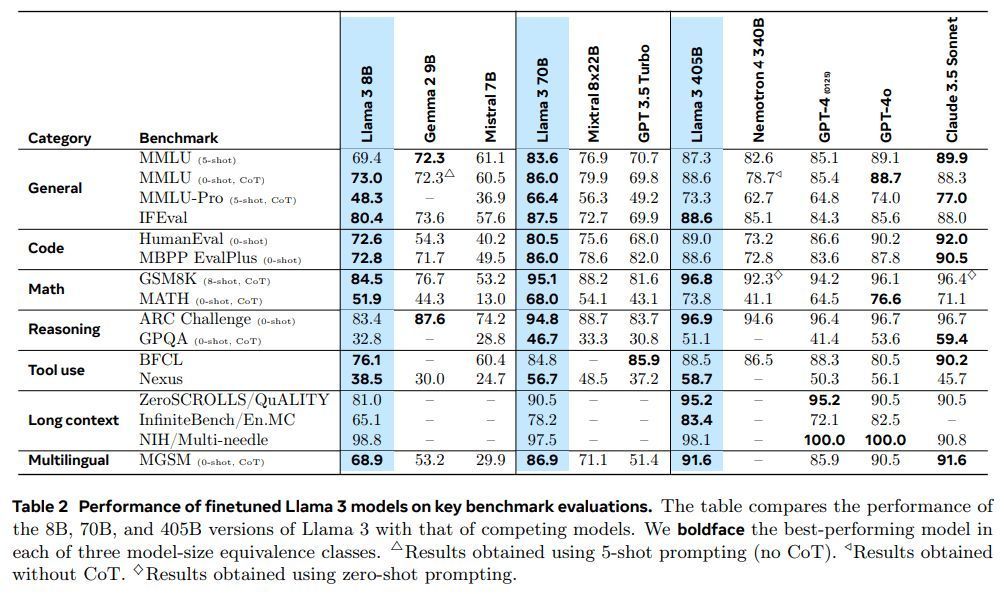 我们这项工作的成果是 Llama 3:一个包含 8B、70B 和 405B 参数的三种多语言1语言模型的群体。我们在大量基准数据集上评估了 Llama 3 的性能,这些数据集涵盖了广泛的语言理解任务。此外,我们还进行了广泛的人工评估,将 Llama 3 与竞争模型进行了比较。表 2 展示了旗舰 Llama 3 模型在关键基准测试中的性能概述。我们的实验评估表明,我们的旗舰模型在各种任务上都与 GPT-4(OpenAI,2023a)等领先语言模型持平,并且接近于最先进水平。我们较小的模型是同类中最好的,其性能优于具有相似参数数量的其他模型(Bai 等人,2023 年;Jiang 等人,2023 年)。Llama 3 在帮助性和无害性之间也取得了比其前身(Touvron 等人,2023b)更好的平衡。我们在第 5.4 节中详细分析了 Llama 3 的安全性。