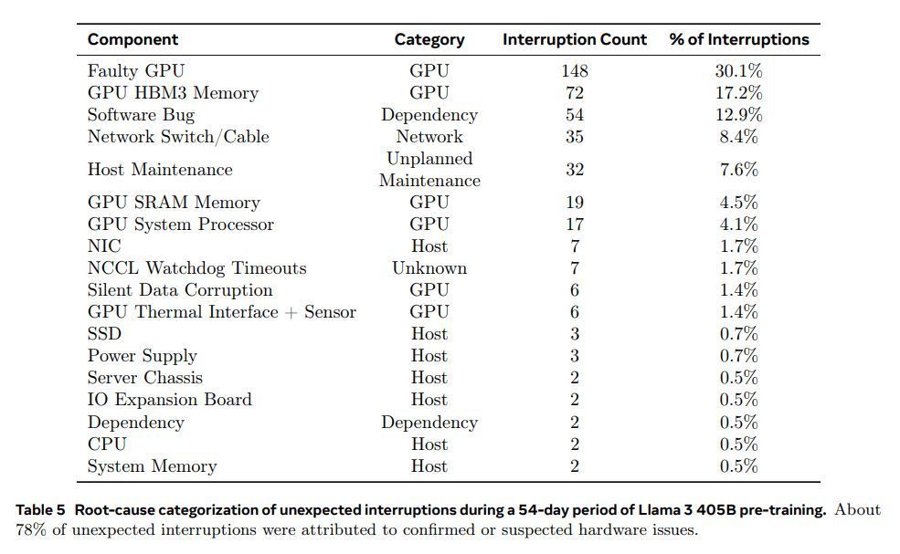 16K GPU 训练的复杂性和潜在故障场景超过了我们操作过的更大的 CPU 集群。此外,训练的同步性质使其容错性较低——单个 GPU 故障可能需要重新启动整个作业。尽管面临这些挑战,但对于 Llama 3,我们在支持自动集群维护(例如固件和 Linux 内核升级 (Vigraham 和 Leonhardi,2024))的同时,实现了高于 90% 的有效训练时间,这导致了每天至少一次训练中断。