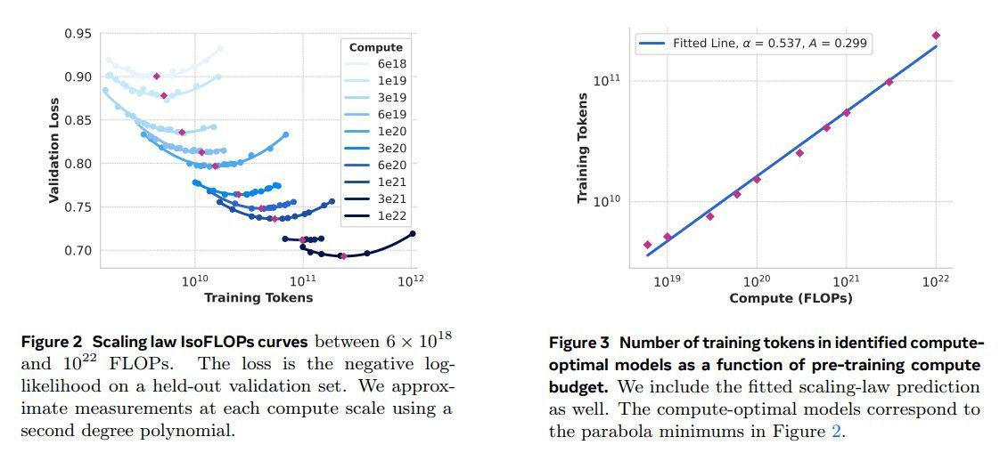 这些实验产生了图 2 中的 IsoFLOPs 曲线。这些曲线中的损失是在单独的验证集上测量的。我们使用二阶多项式拟合测得的损失值,并确定每个抛物线的最小值。我们将抛物线的最小值称为相应预训练计算预算下的计算最优模型。