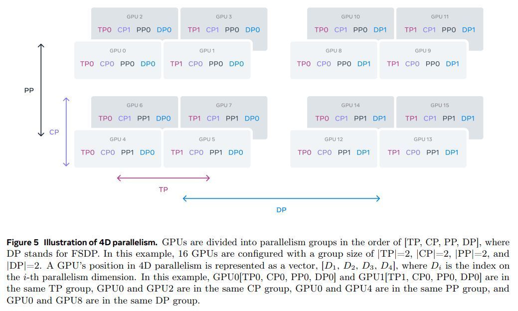 为了扩大我们最大模型的训练规模,我们使用 4D 并行技术 - 一种结合四种不同并行方法的方案 - 对模型进行分片。这种方法有效地将计算分布到许多 GPU 上,并确保每个 GPU 的模型参数、优化器状态、梯度和激活值都能够容纳在它的 HBM 中。我们的 4D 并行实现(如 et al. (2020);Ren et al. (2021);Zhao et al. (2023b)) 所示,它对模型、优化器和梯度进行分片,同时实现了数据并行,该并行方法在多个 GPU 上并行处理数据并在每个训练步骤后进行同步。我们使用 FSDP 对 Llama 3 的优化器状态和梯度进行分片,但对于模型分片,我们不会在正向计算后重新分片,以避免在反向传递过程中发生额外的全收集通信。