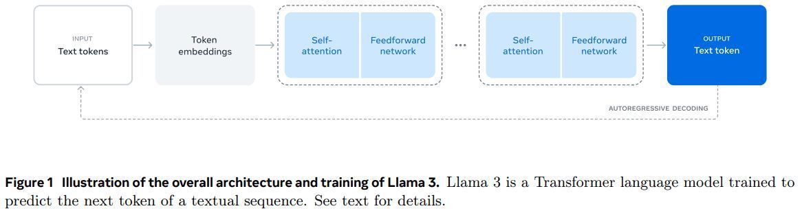 Llama 3 模型架构如图 1 所示。我们 Llama 3 语言模型的开发主要分为两个阶段: