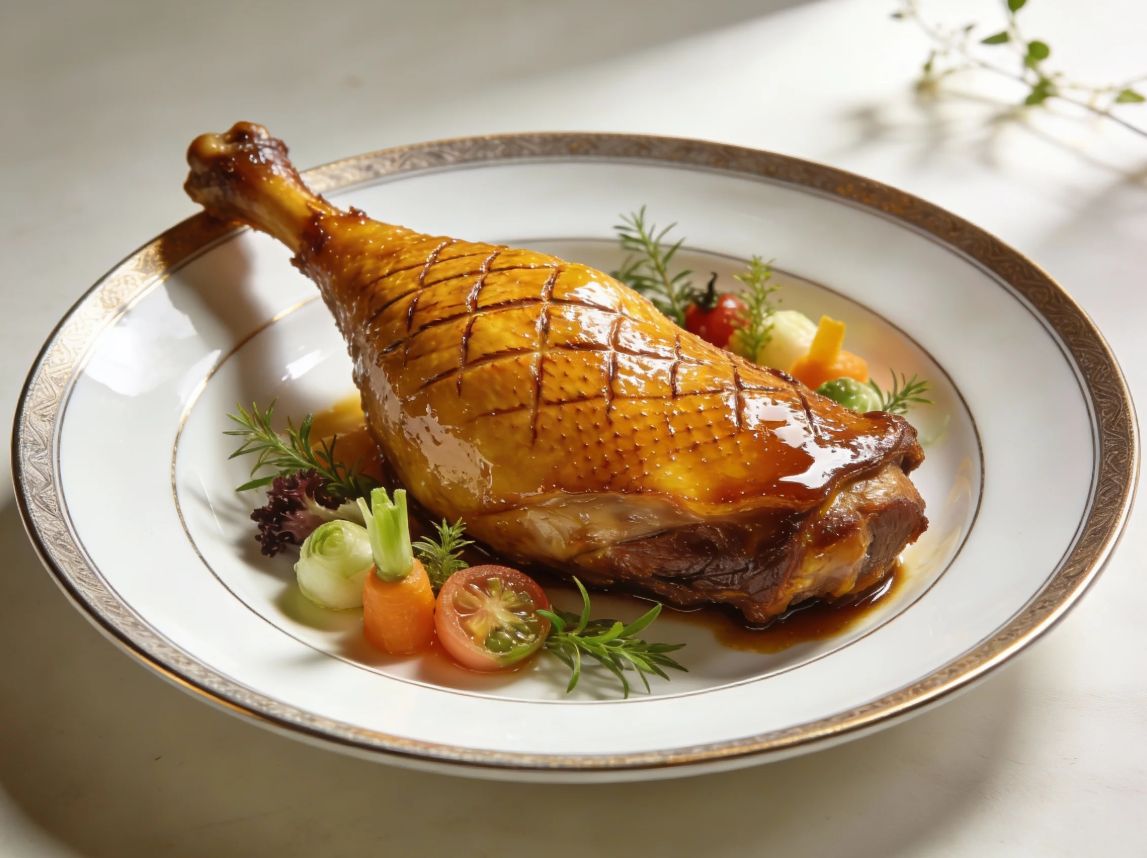 融合技法的自信展示:娴熟运用“烟熏”(西式常见)与“油封”(法餐精髓)两种外来技法,并加以改良,体现了中国厨师“学贯中西,化为己用”的开放心态与高超的学习创新能力。