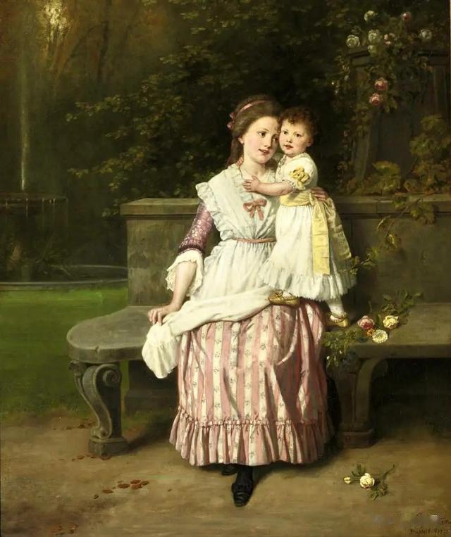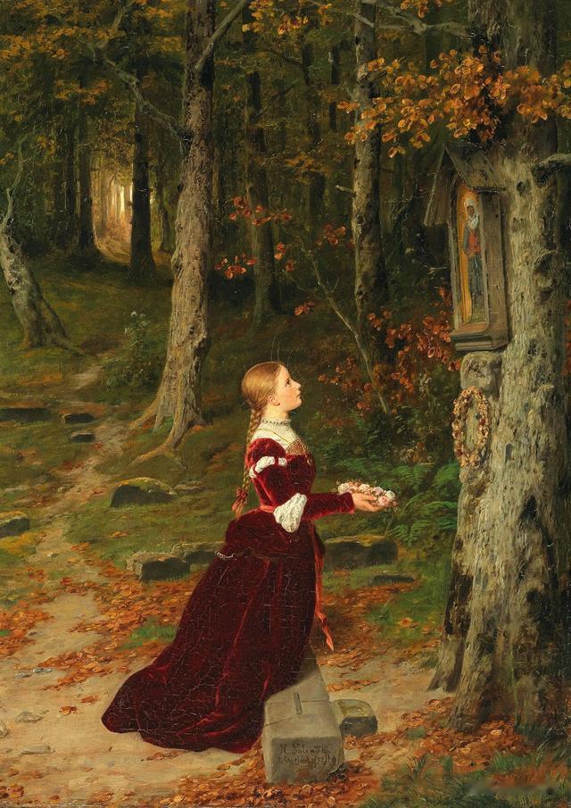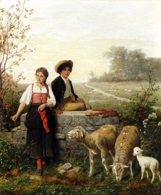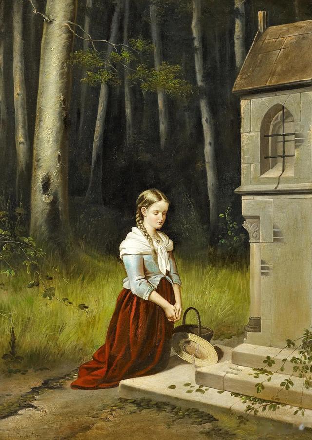 19世纪的莱茵兰乡村,农舍的炊烟与市集的喧嚣交织成画。Hubert Salentin的画笔总在捕捉这些平凡的瞬间,将琐碎日常升华为永恒的诗意。他的《老妇人纺纱》里,阳光斜斜地爬上斑驳的砖墙,老妇人手中的纺锤仿佛凝固了时间。粗布裙摆的褶皱、木地板的裂痕,每一笔都浸透对生活的凝视。