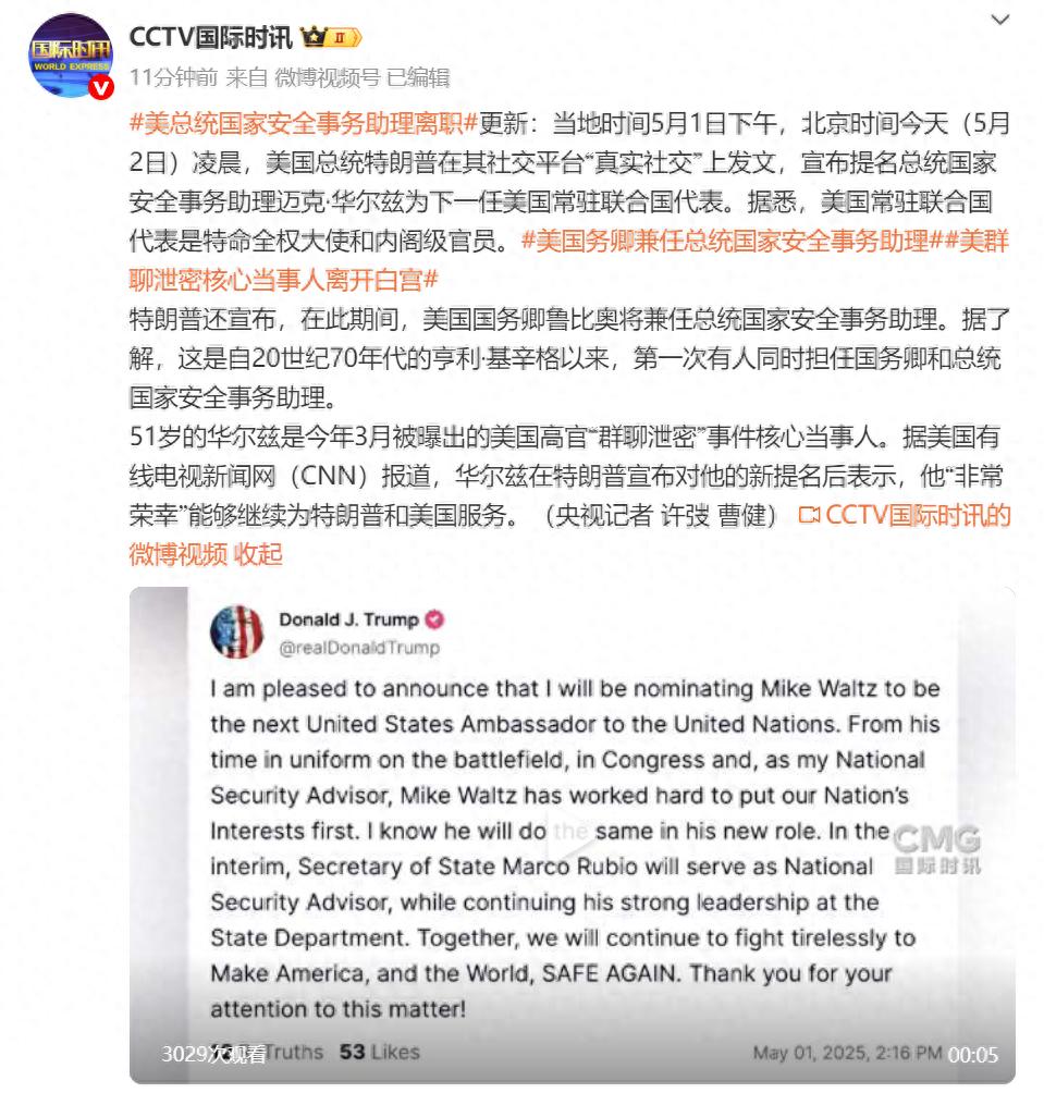北京时间今天凌晨,特朗普在自己的社交平台"真实社交"上扔出一颗重磅炸弹——提名现任总统国家安全事务助理迈克·华尔兹出任美国常驻联合国代表。更让人意外的是,国务卿鲁比奥将同时兼任国家安全事务助理,这可是自上世纪70年代基辛格以来头一遭。这一连串操作看似平常,实则暗藏玄机,把特朗普的政治手腕展现得淋漓尽致。