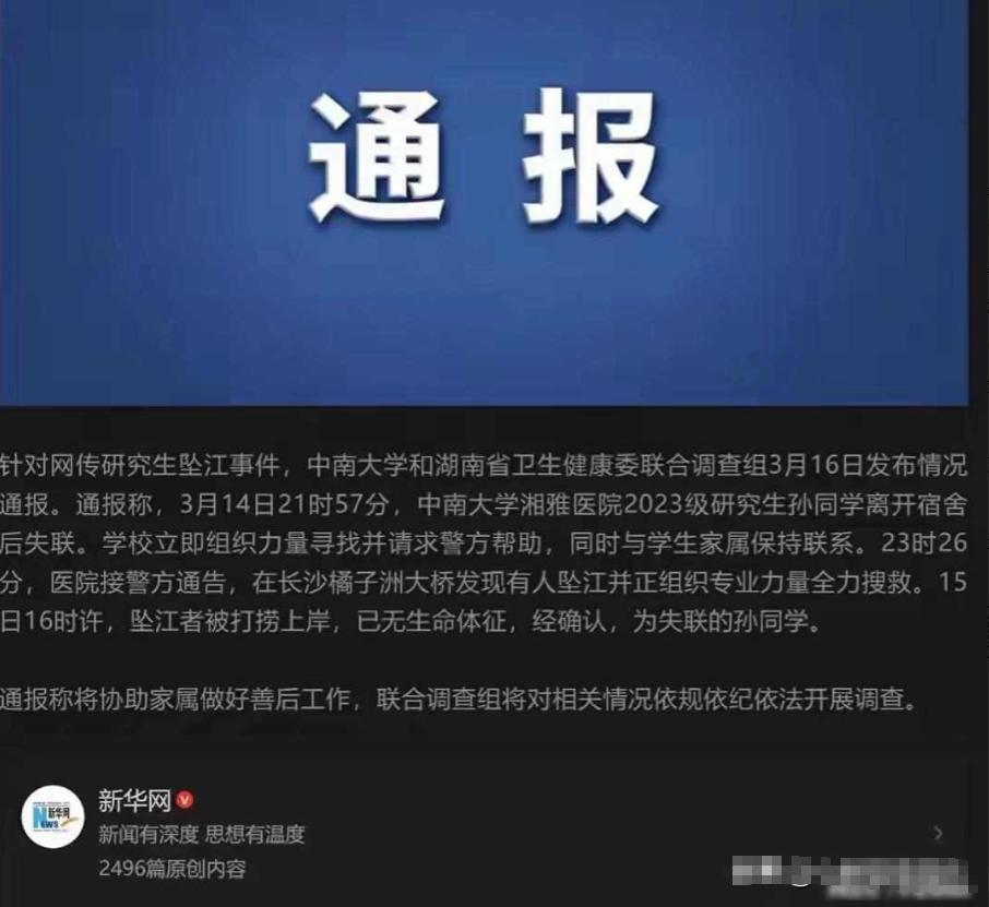 3月14日晚上9点57分,中南大学湘雅医院的一名硕士生孙某钰离开宿舍;11点03分,她在社交平台发了两条消息,说夜班结束了,并向大家告别,之后就再也联系不上了。过了大约23分钟,有人报警称橘子洲大桥有人跳江。第二天下午4点,她的遗体在湘江被找到,身份也被确认。