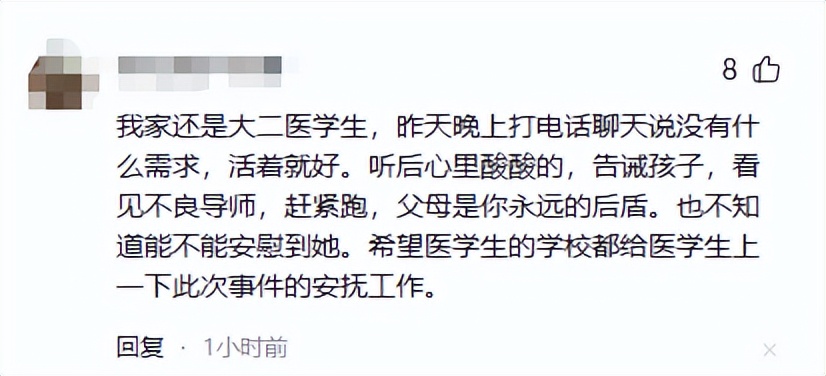 有位网友说,自己家孩子也是学医的,还在大二。前一天晚上打电话聊天,孩子说“也没啥要求,能好好活着就行”。听完这句话,心里挺不是滋味的。她也跟孩子说:如果遇到不好的导师,一定要早点离开,别硬扛,家里永远是你的后盾。只是她也不确定,这样的话能不能真的安慰到孩子。她还希望,各个医学院校能重视这件事,给医学生多一些关心和疏导。