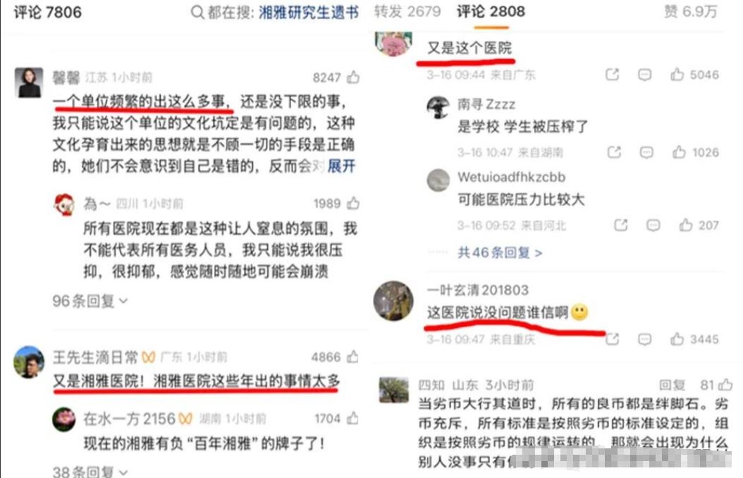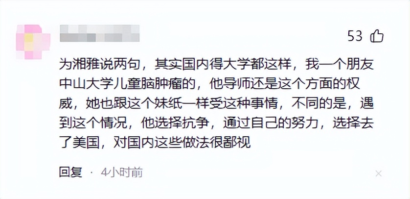 也有不同立场的网友说:“替湘雅说了句公道话:其实不只是这一所学校,国内不少高校都有类似的问题。有个网友提到,他有个朋友在中山大学做儿童脑肿瘤方向,导师还是这个领域的权威。但她也经历过类似的情况,压力很大。不同的是,她没有一直忍着,而是选择去争取改变,后来靠自己的努力去了美国,对国内这些做法也比较反感。”