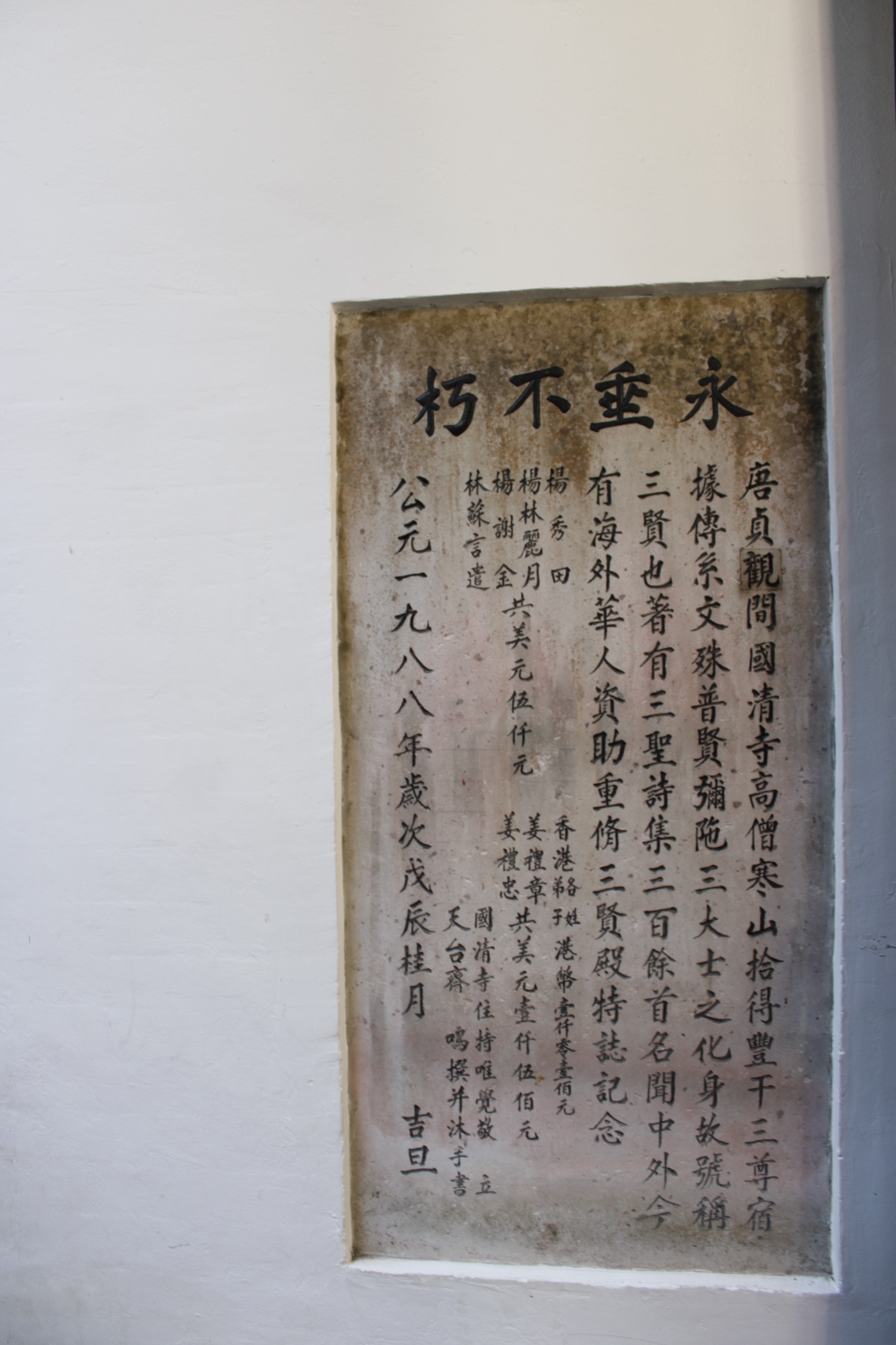 国清寺有三贤殿,供寒山、丰干禅师和拾得。寒山问曰:“世间有人谤我、欺我、辱我、笑我、轻我、贱我、恶我、骗我,该如何处之乎?”拾得答曰:“只需忍他、让他、由他、避他、耐他、敬他、不要理他、再待几年,你且看他。