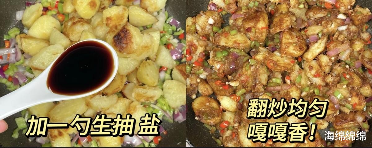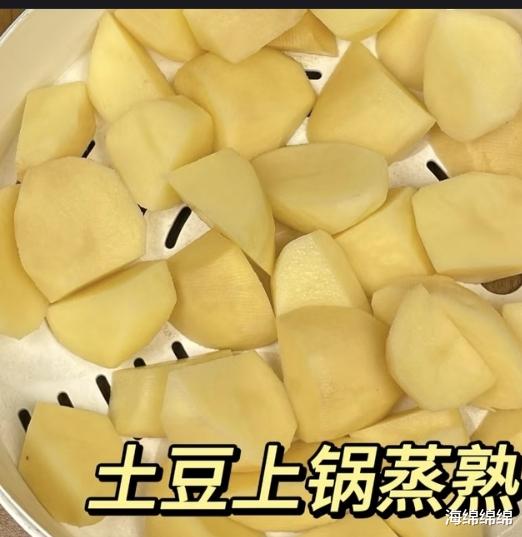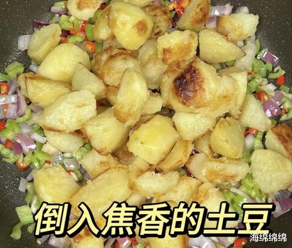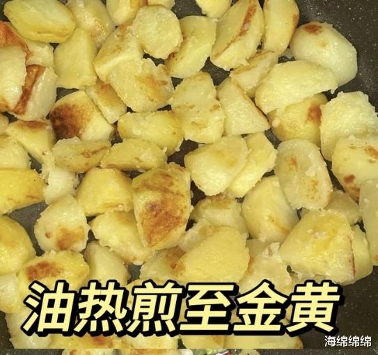 第二步,煎土豆。锅中倒油,油热后放入蒸好的土豆块,中小火煎至表面金黄焦香。煎的时候要轻轻晃动锅子,让土豆均匀受热,别煎糊了。煎好的土豆盛出备用。