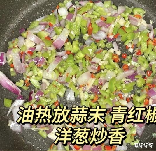第四步,炒洋葱和青红椒。把切好的洋葱块和青红椒块倒入锅中,和蒜末一起翻炒,直到洋葱变软、青红椒断生。洋葱炒到变软后,香气会完全释放,和青红椒的清香融合在一起。
