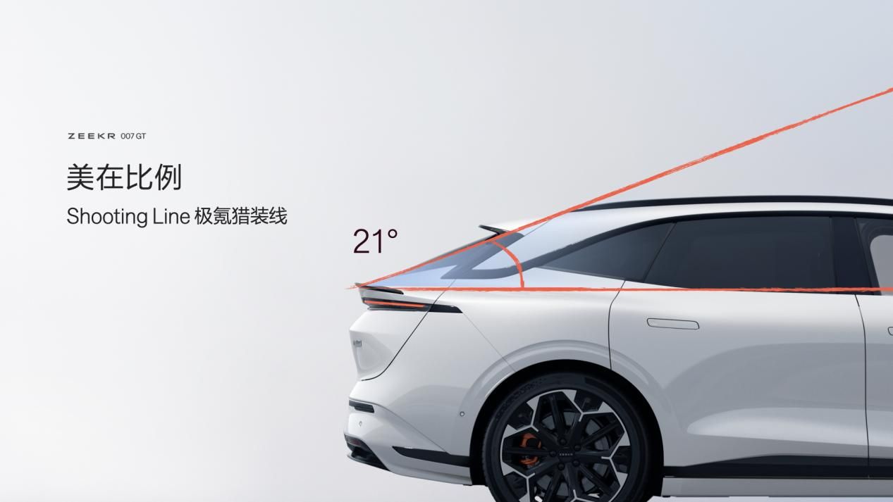 极氪007GT,美在比例。原创Shooting Line极氪猎装线,线条夹角锁定为21°,兼具姿态美、风阻低、空间大,是功能与美学结合的黄金线。夹角过大,整车设计将变得更加中庸方正,更接近传统旅行车。夹角过小,设计将更接近溜背车,第二排和后备厢空间都受到影响。