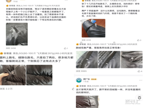 此外,“面料薄、易破、色差大”,“钻绒严重,客服还说正常”也时常被诟病。毕竟两千的价格在这摆着,也不是“便宜货”。
