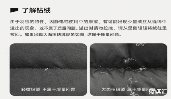 对此,高梵在产品页面特意解释了“钻绒”问题,其称“由于羽绒的特性,因静电或使用中的摩擦,有可能出现少量绒丝从缝线中溢出的现象,这不属于质量问题。如果出现大面积钻绒现象如图,这属于质量问题。”