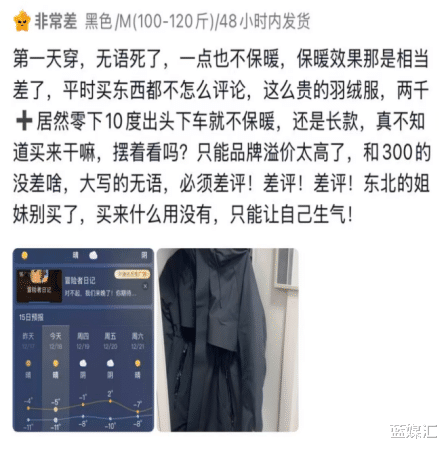更扎心的是,高梵在抖音上差评不少,东北人在保暖这方面最有发言权,有吐槽称:“在东北根本扛不住冻”。