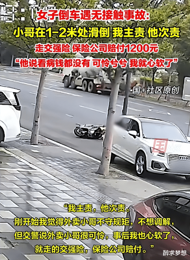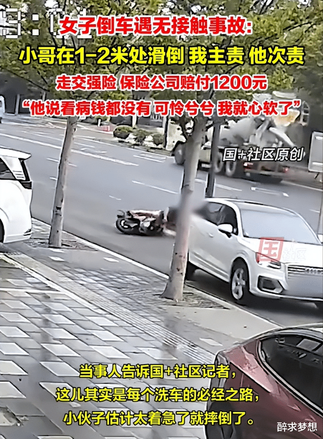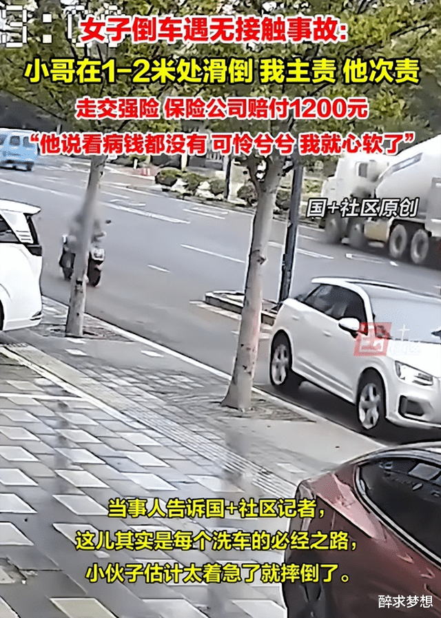 事情是这样的:这位女士在倒车,旁边呢,有一个外卖小哥。按理说,倒车的时候,最怕的就是撞到后面的人或者车。可这位女士倒车的时候,并没有碰到小哥,她自己说,那个小哥是在她车大概1-2米远的地方,突然滑倒了!