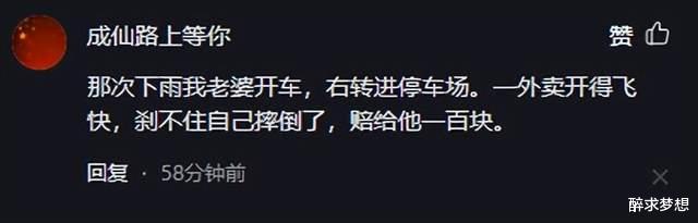 那次下雨我老婆开车,右转进停车场。一外卖开得飞快,刹不住自己摔倒了,赔给他一百块。
