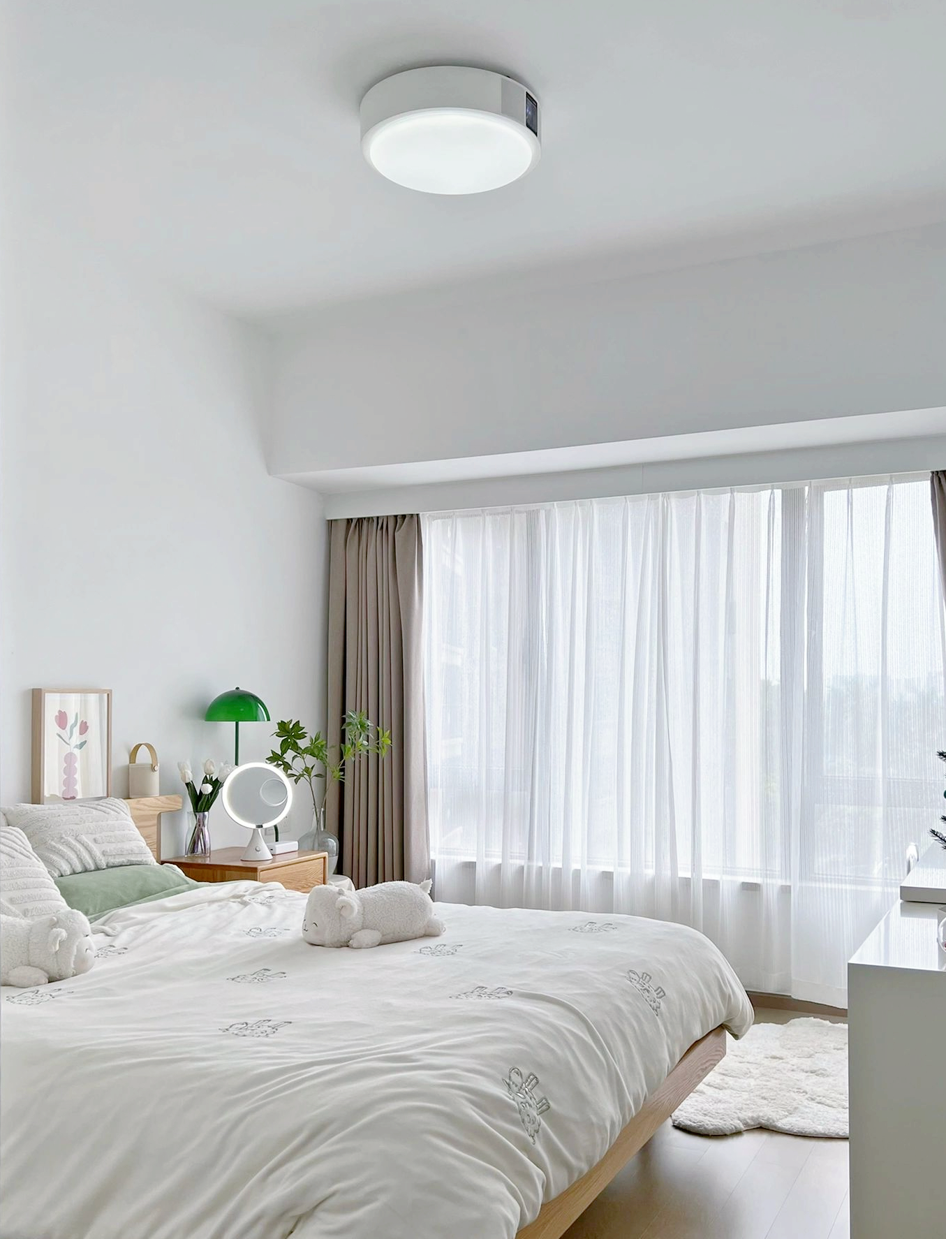 卧室有一面大窗户,虽不是落地窗,但采光充足,与阳台朝向一致,窗外是一片绿意盎然的自然美景。想象一下,每天伴着美景入眠,生活该有多幸福!
