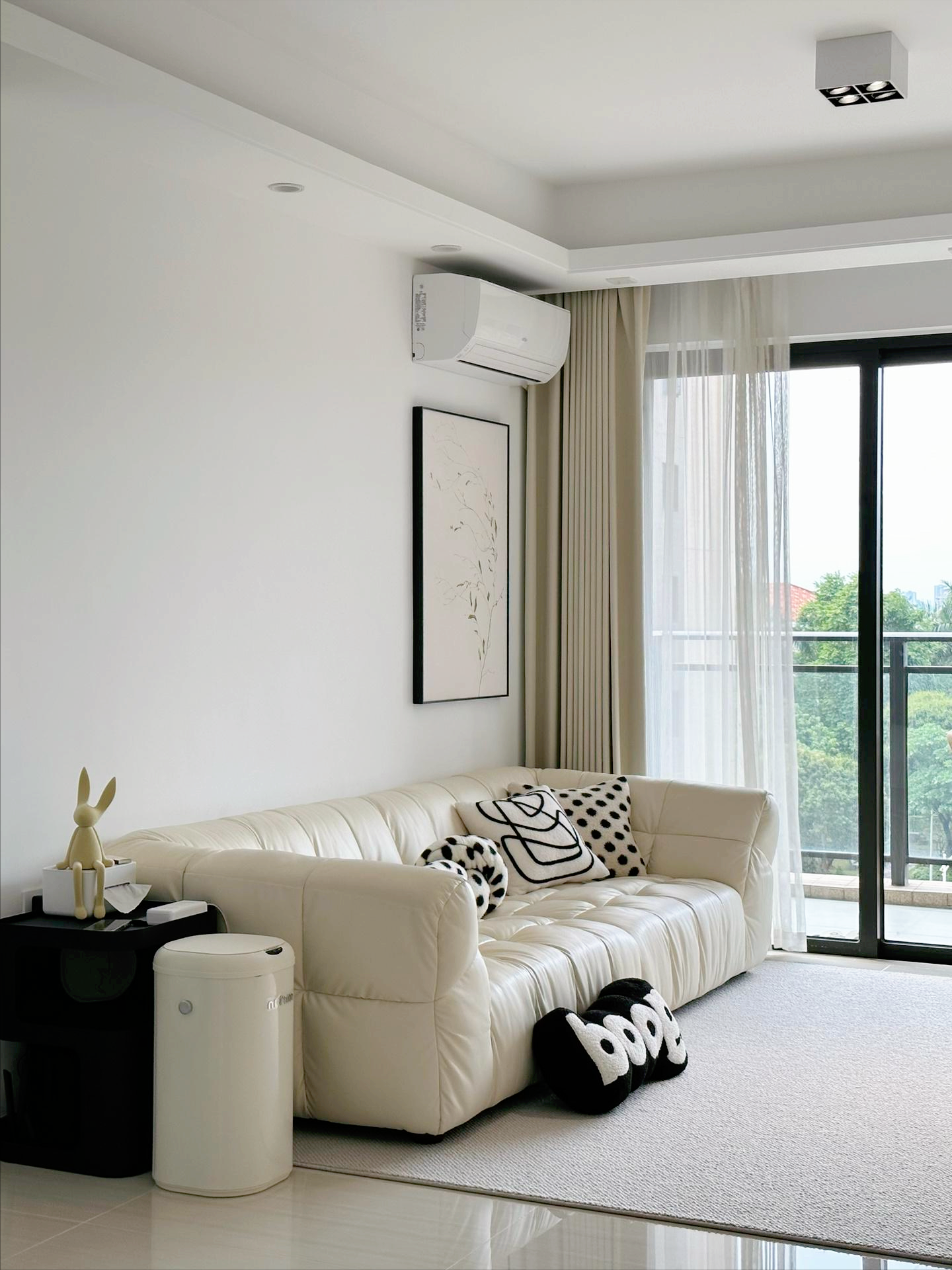 米白色沙发靠墙靠窗,前铺短毛绒素色地毯,中间不放茶几,留出活动空间,减少拥挤感。由于客厅不大,屋主选择了挂机空调,足以满足客餐厅的制冷需求。空调下方挂着一幅抽象画,增添艺术气息。