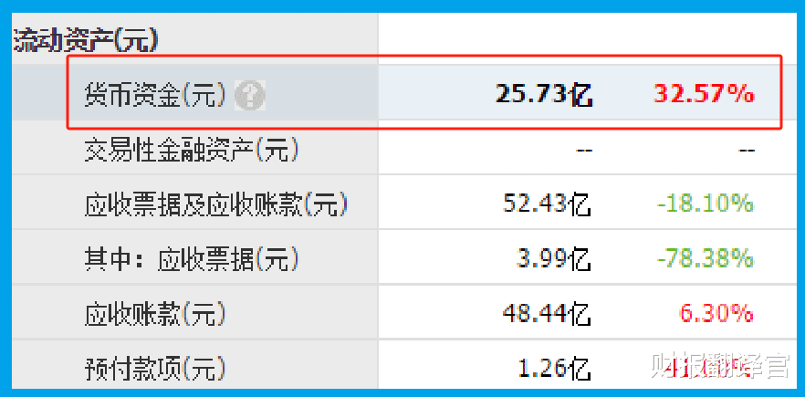而同期,公司短期内能拿出来的现金总额,也就是货币资金竟然高达25.73亿元。这些现金能够完全覆盖短期负债,说明这家企业并没有短期偿债风险。