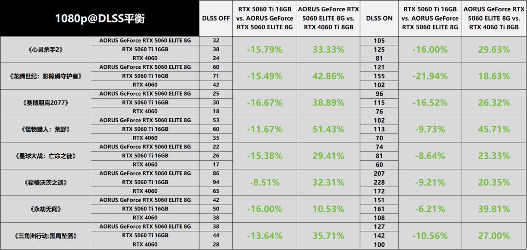 在1080p分辨率测试场景中,性能表现延续了此前的阶梯式分布规律。尽管1080p作为主流分辨率,对GPU性能要求相对缓和,使得显卡性能释放的瓶颈效应有所减弱,但技嘉AORUS GeForce RTX 5060 ELITE 8G与RTX 4060的性能差异依旧泾渭分明。具体实测数据显示,关闭DLSS功能时,前者较后者的平均性能优势稳定维持在28%左右;开启DLSS功能后,性能优势虽略有收窄,但仍保持在23%的可观区间。尤为值得关注的是,在1080p这一硬件需求相对宽松的环境中,该显卡即便不依赖DLSS,也能在本次测试覆盖的半数3A游戏中实现60fps以上的流畅帧率表现,充分满足玩家对“高画质+高流畅度”的核心诉求。