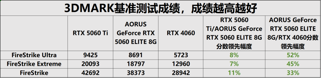 基准性能测试3DMARK理论性能测试作为硬件性能评估的权威标准,其量化数据为剖析显卡硬件规格差异提供了客观、精准的依据。为明确技嘉AORUS GeForce RTX 5060 ELITE 8G的性能定位,我们构建了“跨代+同级”的对比体系,将其与前代对位产品RTX 4060及同级竞品RTX 5060 Ti展开同台测试。实测结果清晰显示,三款显卡的综合性能呈现出层次分明的阶梯式分布,性能梯度一目了然。