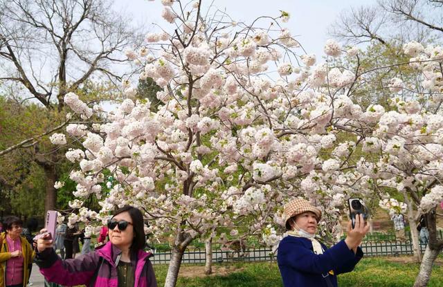 据了解,玉渊潭公园的晚樱以重瓣品种为主,包含关山、松月、普贤象、郁金等品种。其中,关山樱以深粉色重瓣花朵闻名,花团直径可达5厘米,盛开时如层层锦缎堆叠枝头;松月樱则呈现淡粉与纯白交融的渐变色调,花枝低垂如流苏摇曳;普贤象待机时间长,开花过程中颜色变化丰富;稀有品种郁金樱更以黄绿色花瓣独树一帜,在粉色花海中显得尤为清雅。