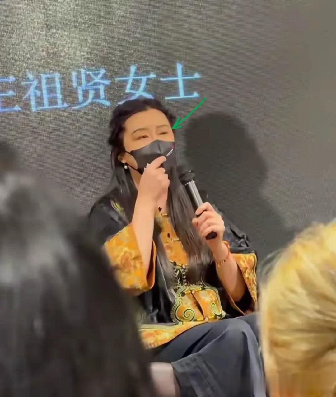 身穿黑黄色中式开衫的她,几乎没有化妆,而是用口罩修饰,一头长发又黑又亮,在人群中还是很吸睛的。一上来,她就先祝大家马年行大运。