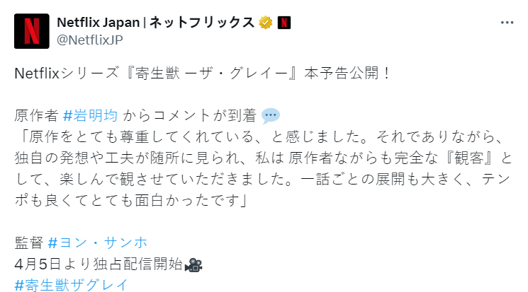 4月5日,《寄生兽:灰色部队》(Parasyte: The Grey)正式上线网飞。